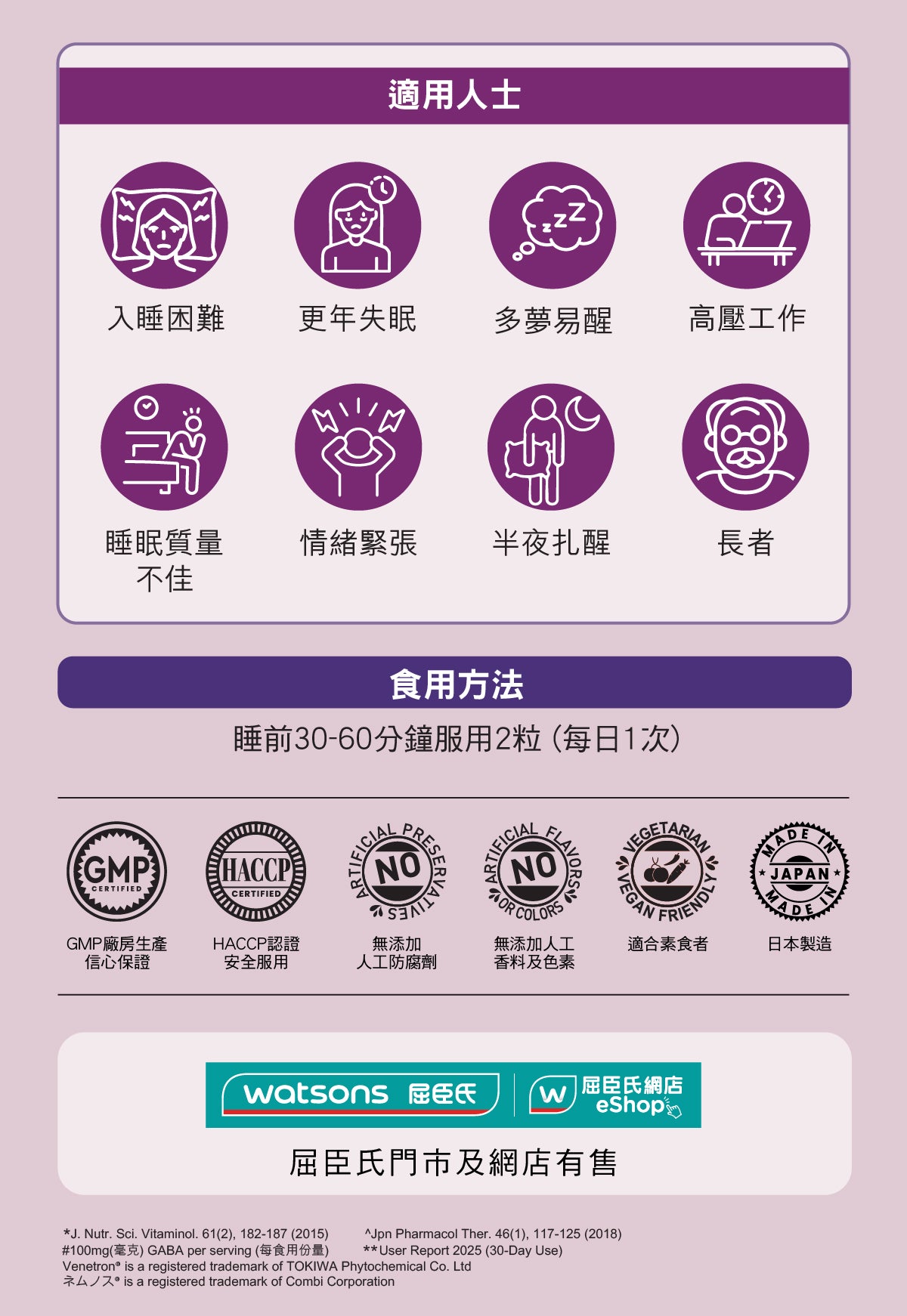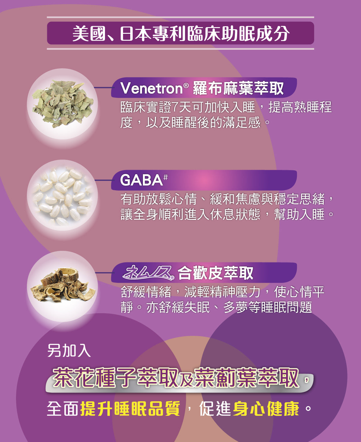 採用美國、日本專利草本,Venetron® 、GABA、合歡皮萃取、茶花種子萃取及菜薊葉萃取,臨床實證能加快入睡、提高熟睡程度、減少扎醒次數以及睡醒後對睡眠的滿足感。完整睡眠提升健康,讓你一覺醒來,感覺清爽、精力充沛,是身心最佳狀態的關鍵。