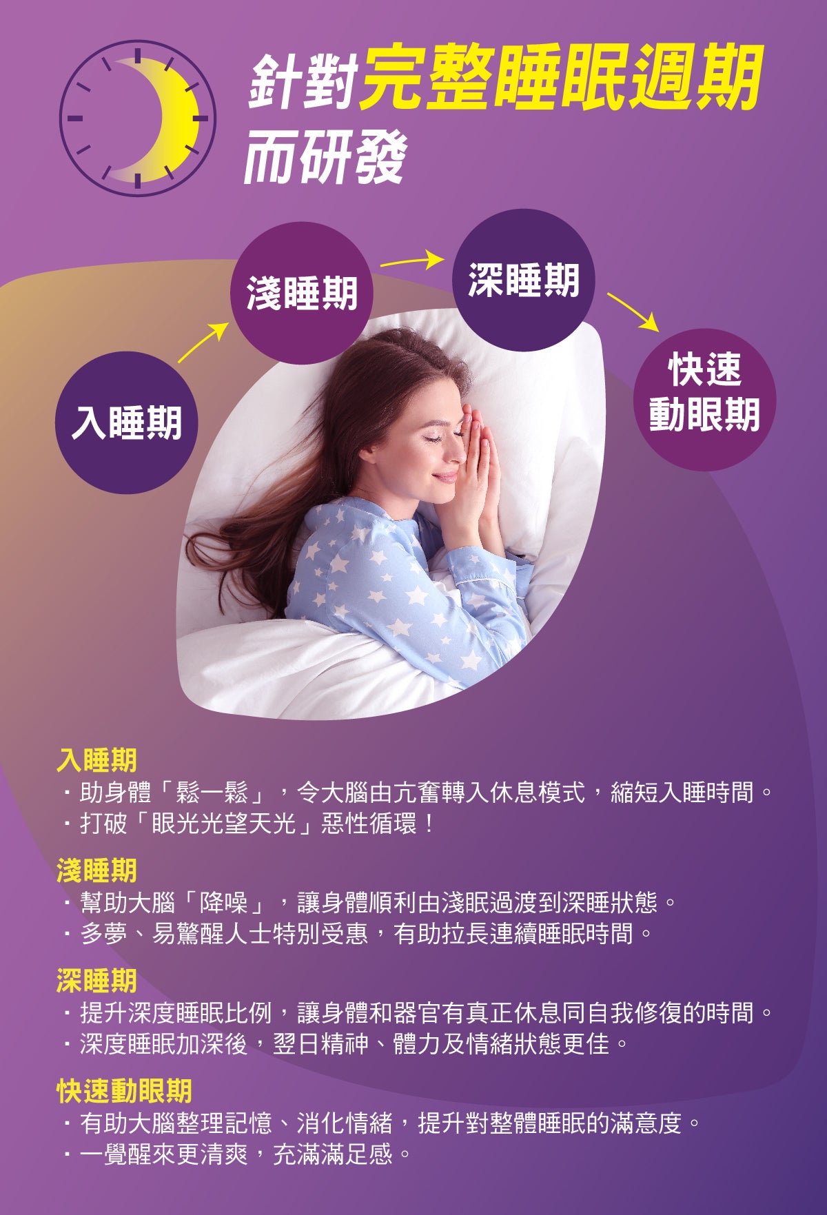 瞓得好,健康基本步!藥劑師推薦配方,專為照顧完整睡眠週期而研發,從淺眠(N1/N2)到深層睡眠(N3)讓身體、器官和大腦有時間休息、保存體力和自我修復,再到REM階段促進記憶、整理情緒。
